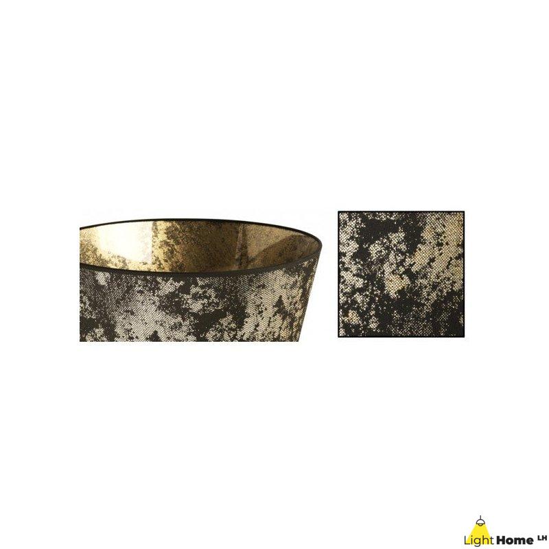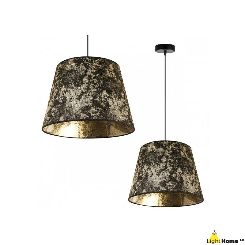 Modna i efektowna lampa wisząca to rozwiązanie wyjątkowo funkcjonalne, dzięki regulacji wysokości i dobremu rozprowadzaniu światła przez abażur w kształcie stożka. Metalowa podsufitka o wyjątkowo niewielkich rozmiarach, została pomalowana na kolor czarny. Klosz jest pokryty materiałem imitującym stare złoto, dzięki czemu wpisuje się w aktualne trendy. Prezentowany model doda prestiżu każdemu pomieszczeniu.