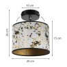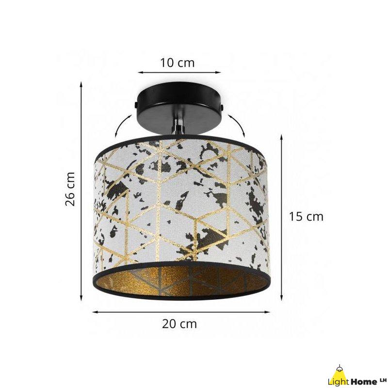 Sufitowo-ścienna lampa, z regulacją powstała w polskiej firmie z wysokiej jakości materiałów. Ma ona materiałowy abażur o średnicy 20 cm. Model jest interesującą propozycją oświetlenia uzupełniającego lub głównego. Elegancki wzór geometryczny w złotym kolorze czyni z niego modny element aranżacji. Podstawa kinkietu jest metalowa i czarna. Materiał zastosowany na kloszu ładnie rozprasza światło.