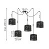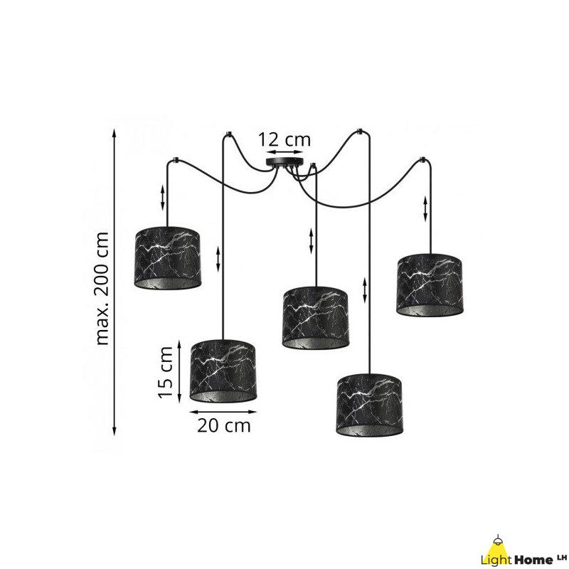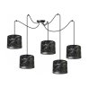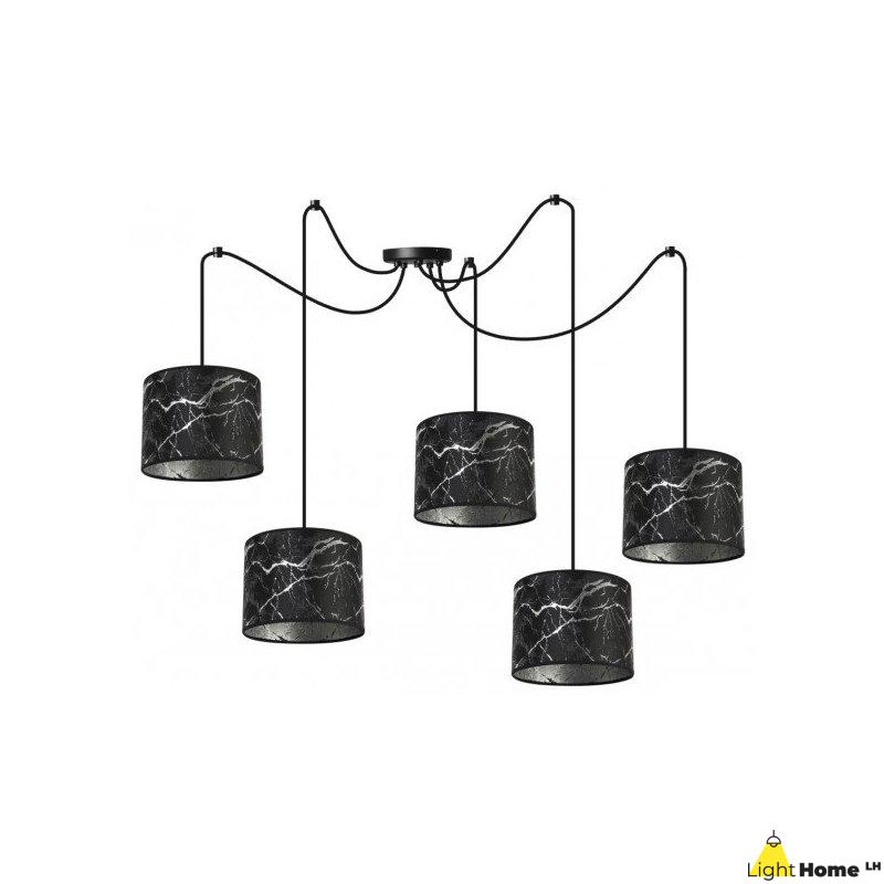 wisząca lampa typu pająk z 5 źródłami światła. Umieszczono je na metalowej konstrukcji w czarnym kolorze. Abażury wykonano z tkaniny w modny wzór. Czarno-srebrna kolorystyka i ponadczasowy motyw marmuru decydują o tym, że lampa będzie modnie prezentować się w naszych mieszkaniach. Ciekawym rozwiązaniem są regulowane, elastyczne ramiona, które pozwalają na różnoraki montaż.