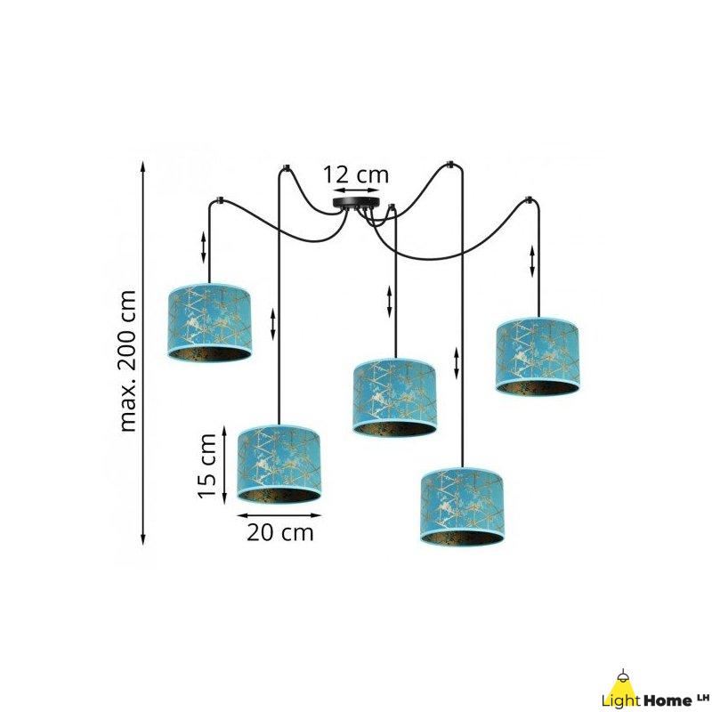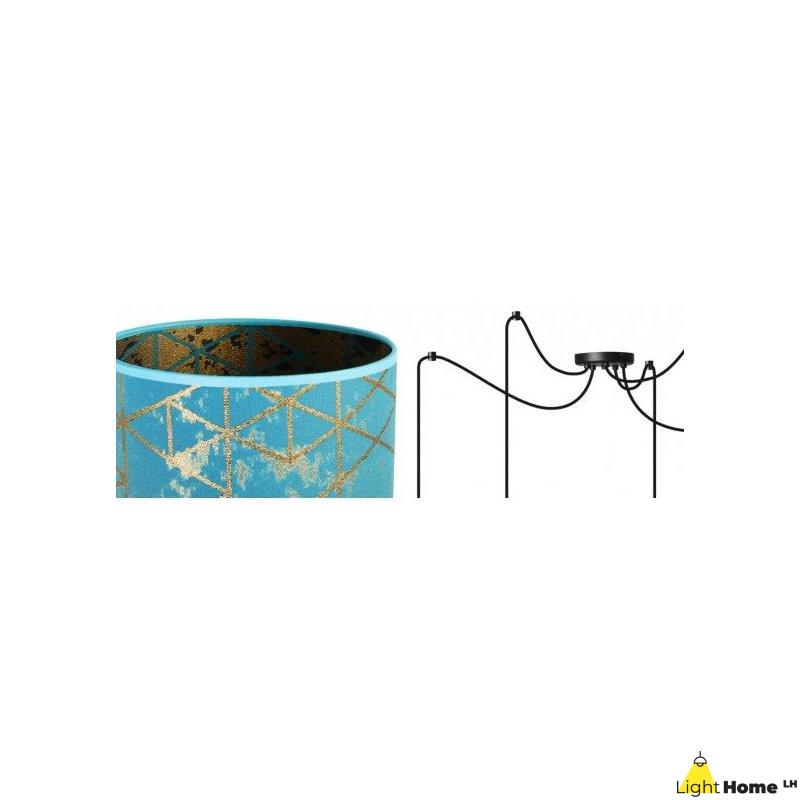 Polskiej produkcji lampa wisząca typu spider wykonana została z materiałów wysokiej jakości. 5 tkaninowych kloszy we wzór geometryczny umieszczono na solidnej, metalowej konstrukcji. Niebiesko-złota kolorystyka i ponadczasowy motyw geometryczny sprawią, że modnie zaprezentuje się w naszych mieszkaniach. Atrakcyjnym rozwiązaniem są giętkie, regulowane ramiona, które pozwolą na zróżnicowany montaż.