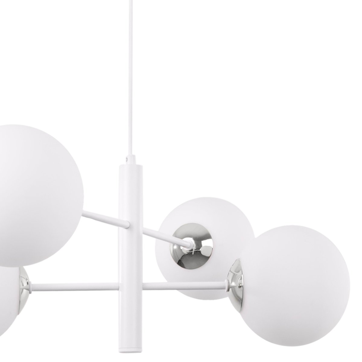 Białe klosze w kształcie kul to jeden z najbardziej rozpoznawalnych elementów tego modelu. Wykonane z mlecznego szkła, tworzą przyjemne, równomierne rozproszenie światła — idealne, kiedy zależy Ci na stworzeniu przytulnej atmosfery w salonie lub jadalni.