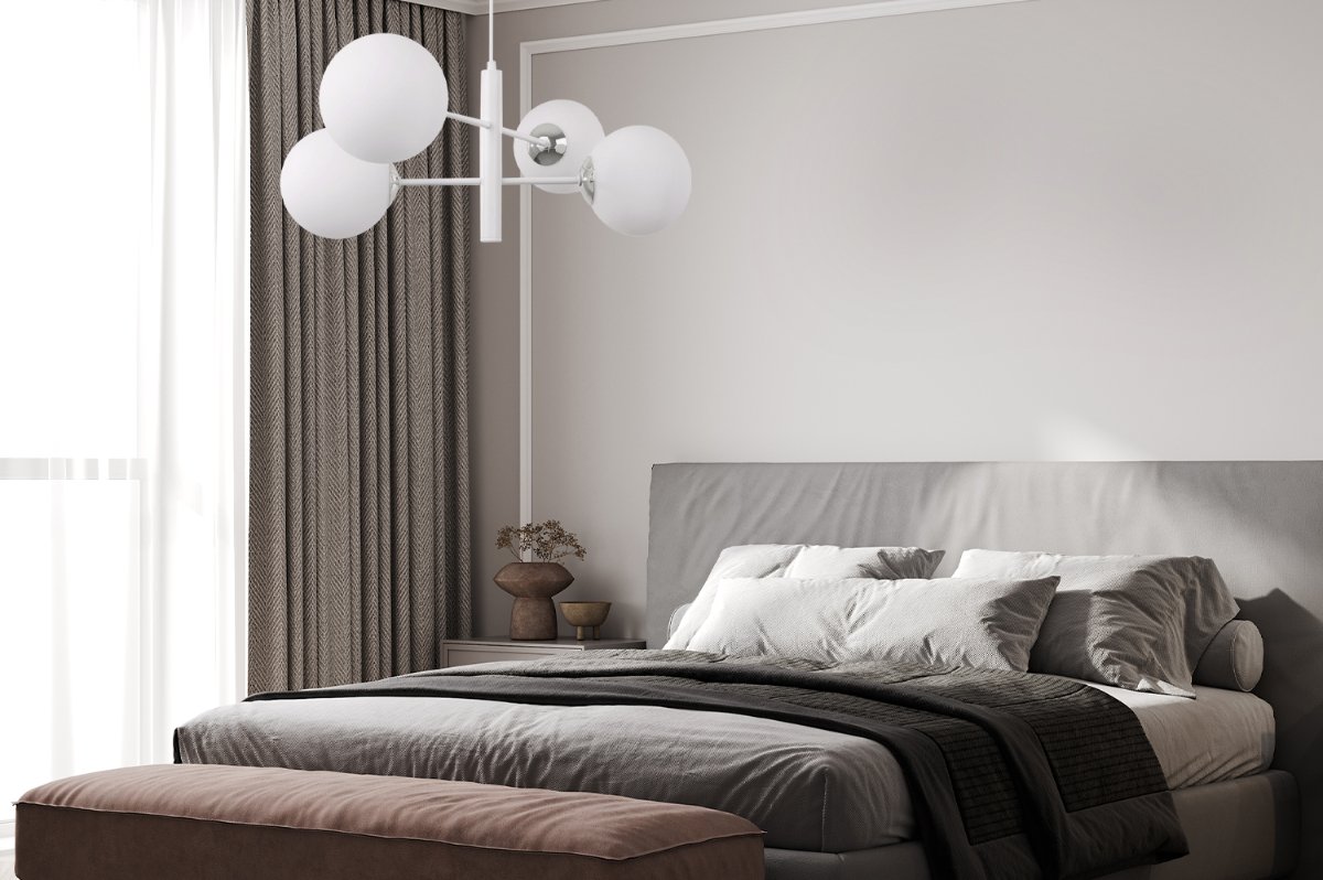 Ten kontrast między chłodnymi metalowymi elementami a przyjemnie rozpraszającym światłem kloszy sprawia, że lampa jest zarówno nowoczesna, jak i przyjazna w odbiorze. Czarne lub srebrne elementy ramion podkreślają jej ponadczasowy charakter, a białe klosze harmonizują z różnymi stylami wnętrz — od minimalistycznych po te bardziej klasyczne.