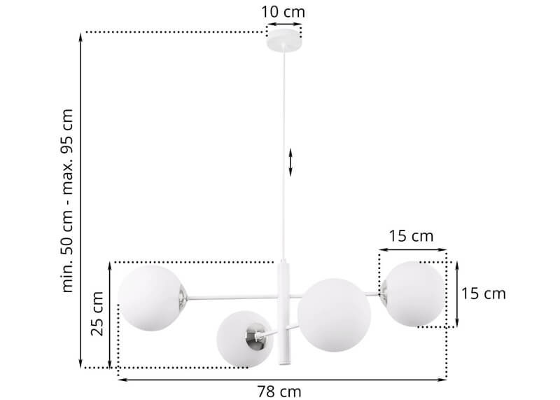 Szerokość całkowita: ~78 cm — to optymalna szerokość, która pozwala lampie pełnić rolę centralnego punktu świetlnego nad stołem czy sofą.